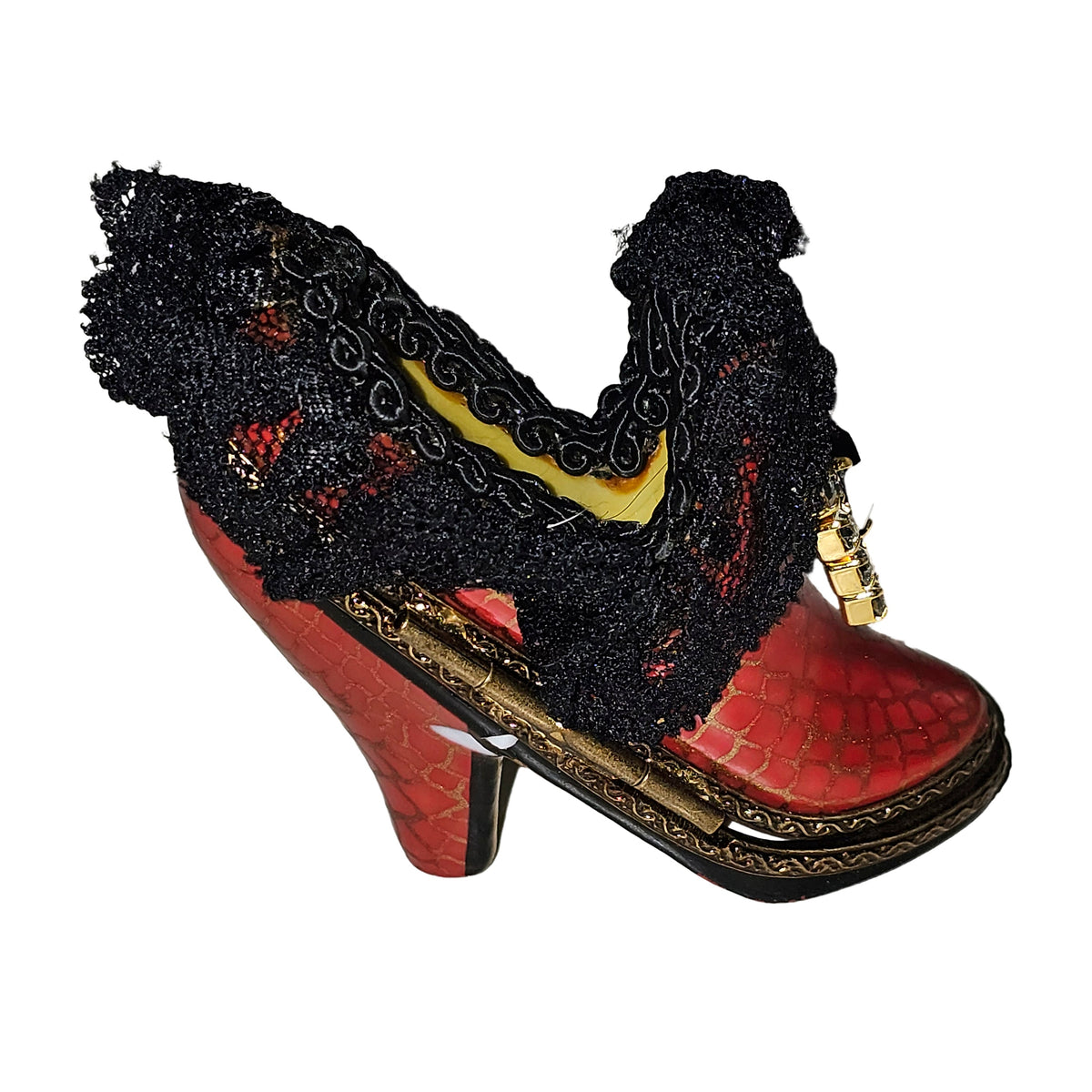 Perfect for fashion enthusiasts and home decor aficionados alike, this Limoges Box is a statement piece that guarantees to impress. Elevate your space with this luxurious decor item, and enjoy the vintage charm it brings to your collection.